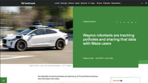 https://techcrunch.com/2026/04/09/waymo-robotaxis-are-tracking-potholes-and-sharing-that-data-with-waze-users/